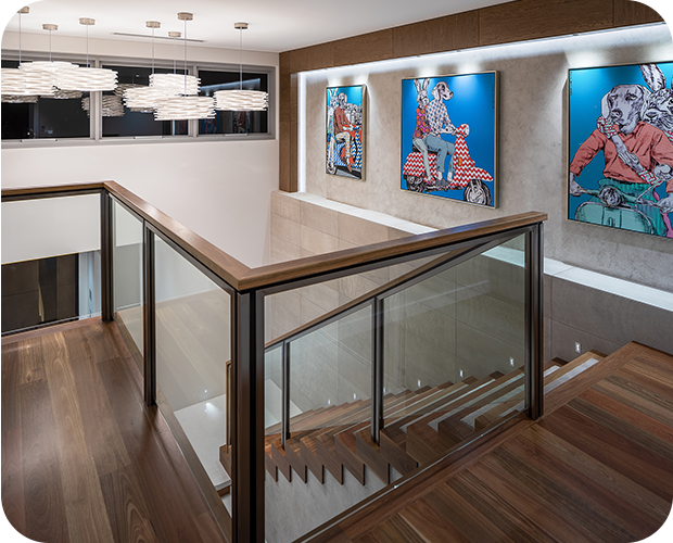 Unique balustrade combining timber, stainless steel, glass and resin